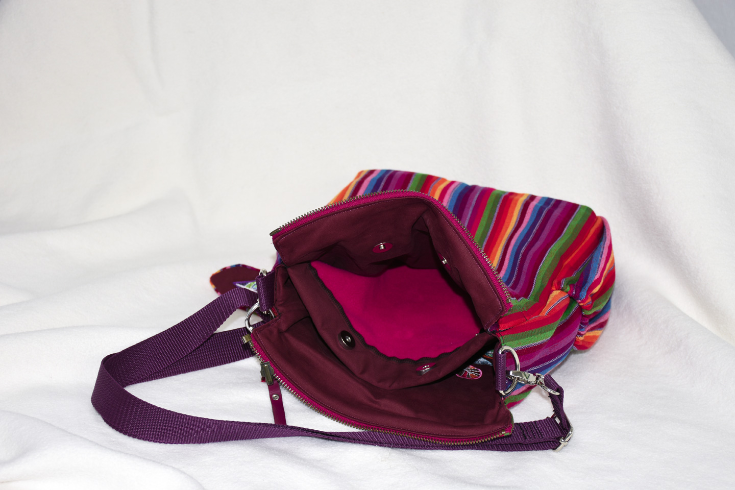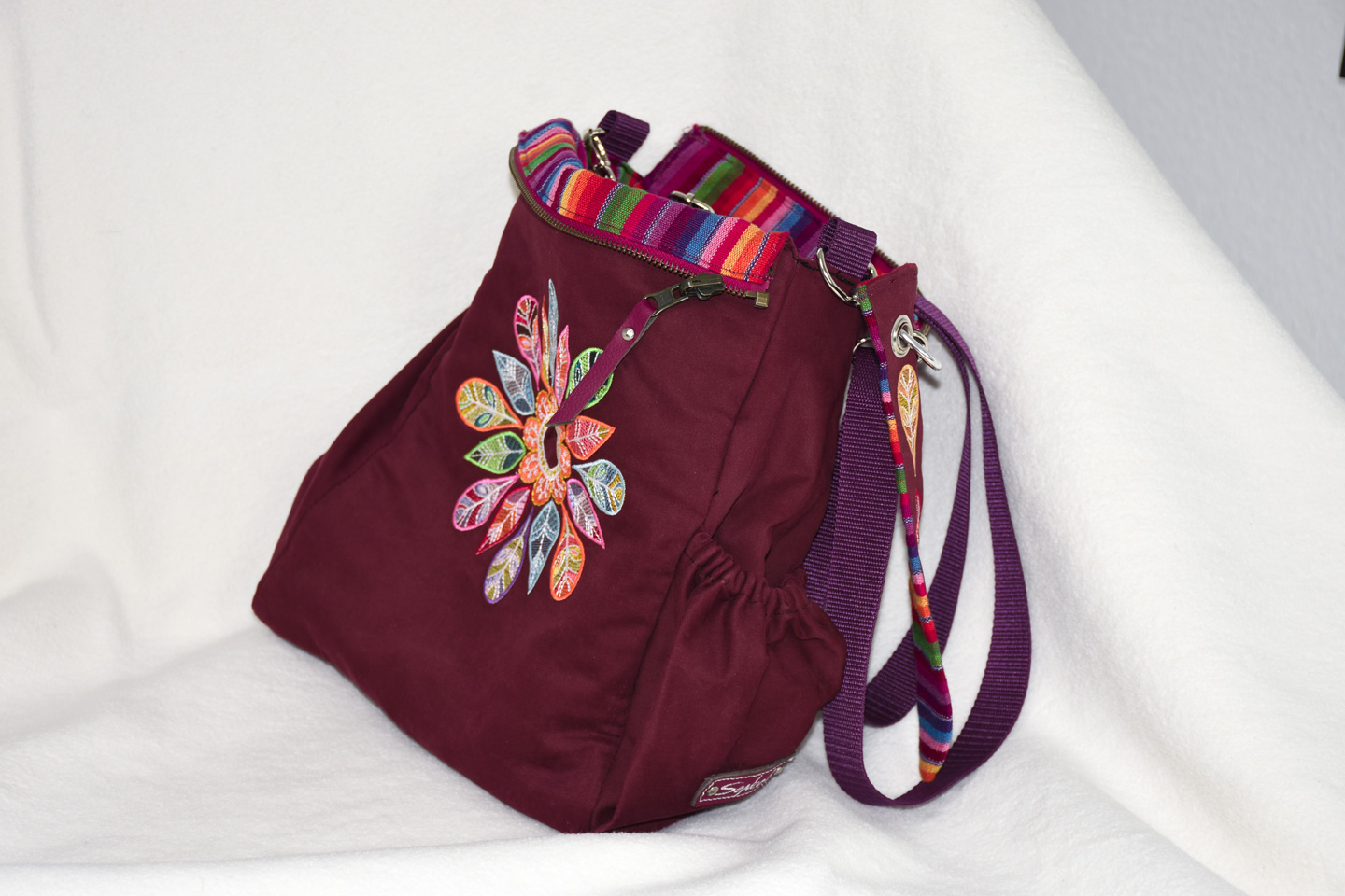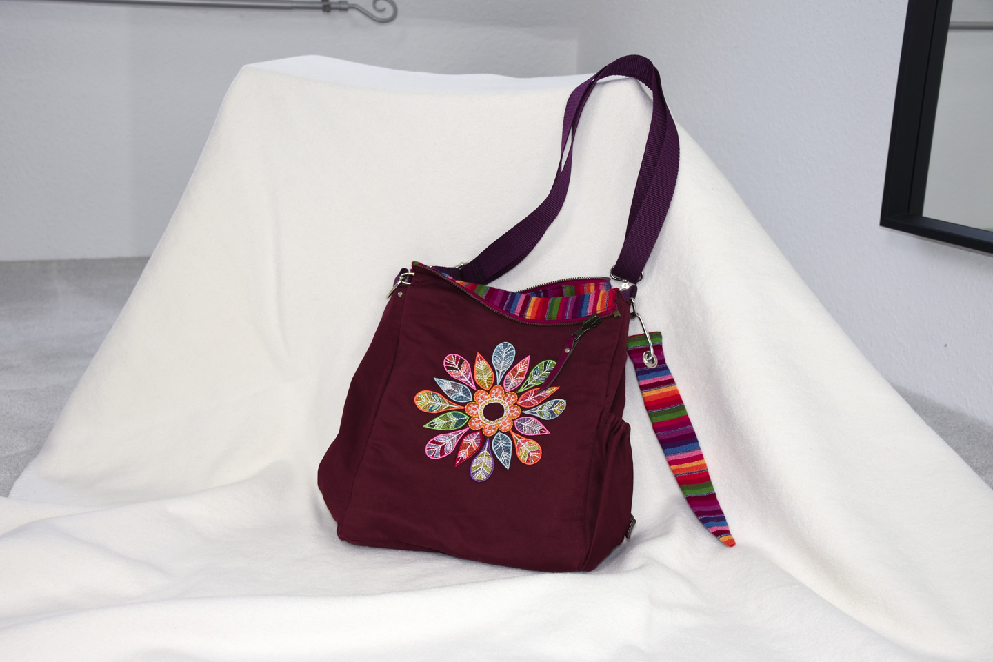 Die Wendetasche Alina hat ein Rainbow Innenfutter passend zum bordeauxfarbenem edlen Außenstoff. Das Stickmuster zeigt ein Mandala und gewendet erstrahlen die Regenbogenfarben.