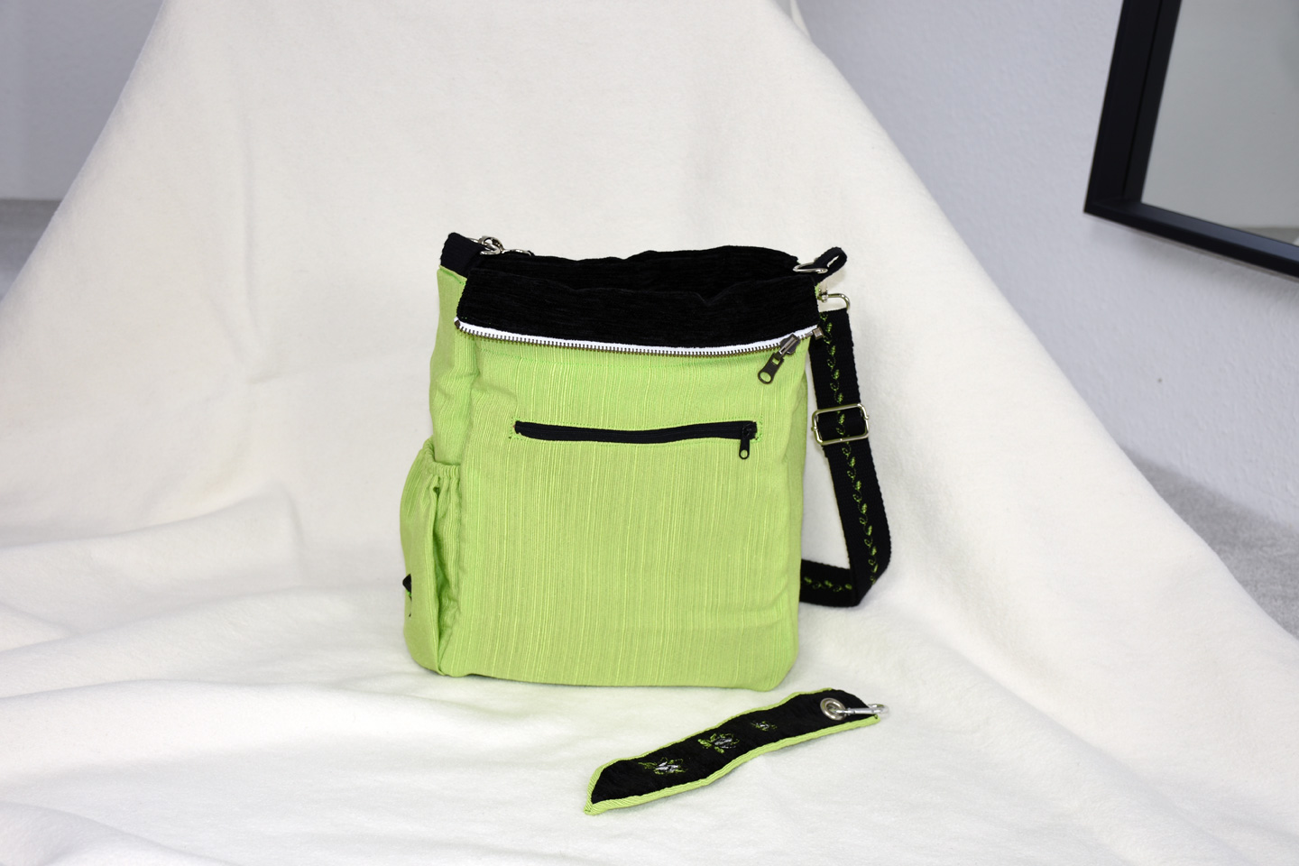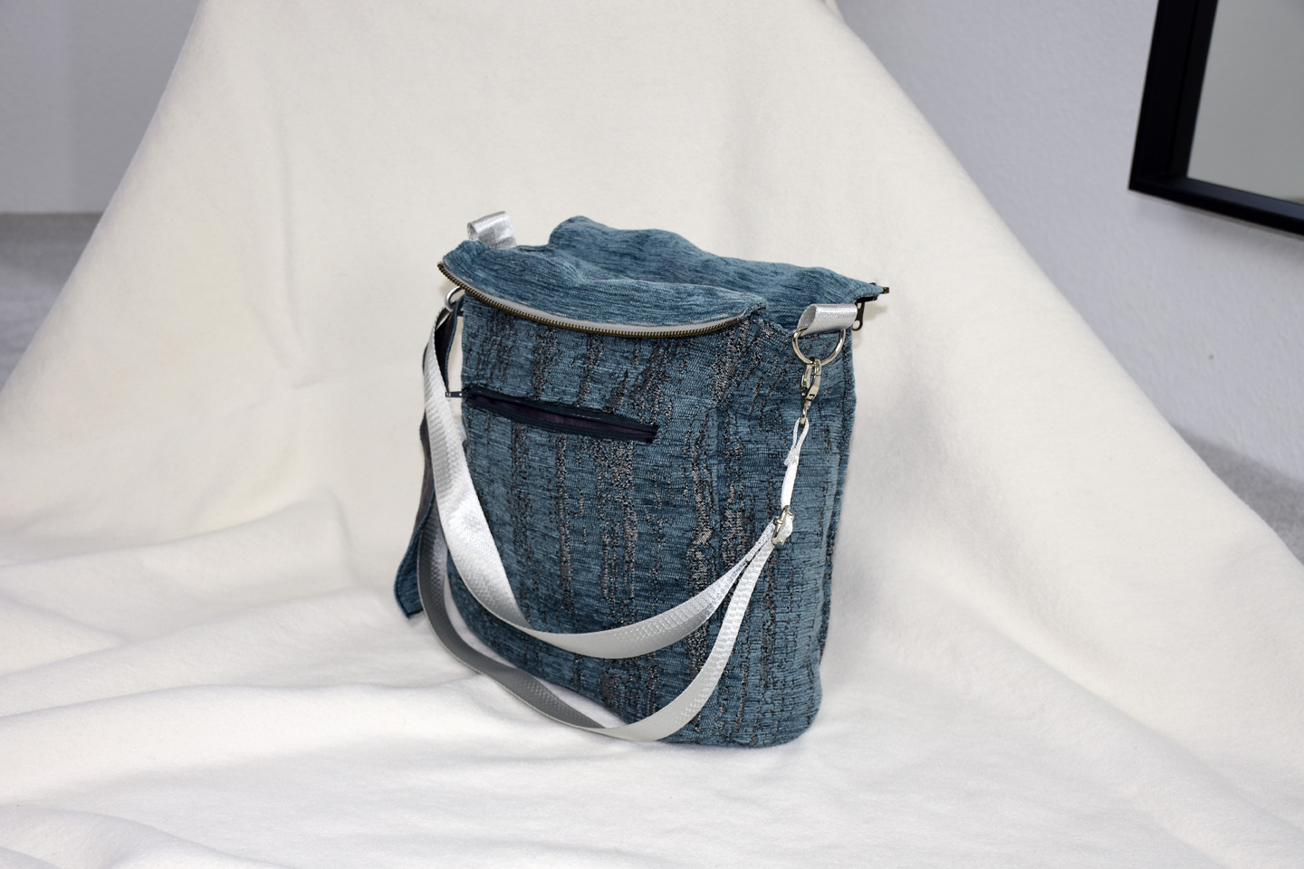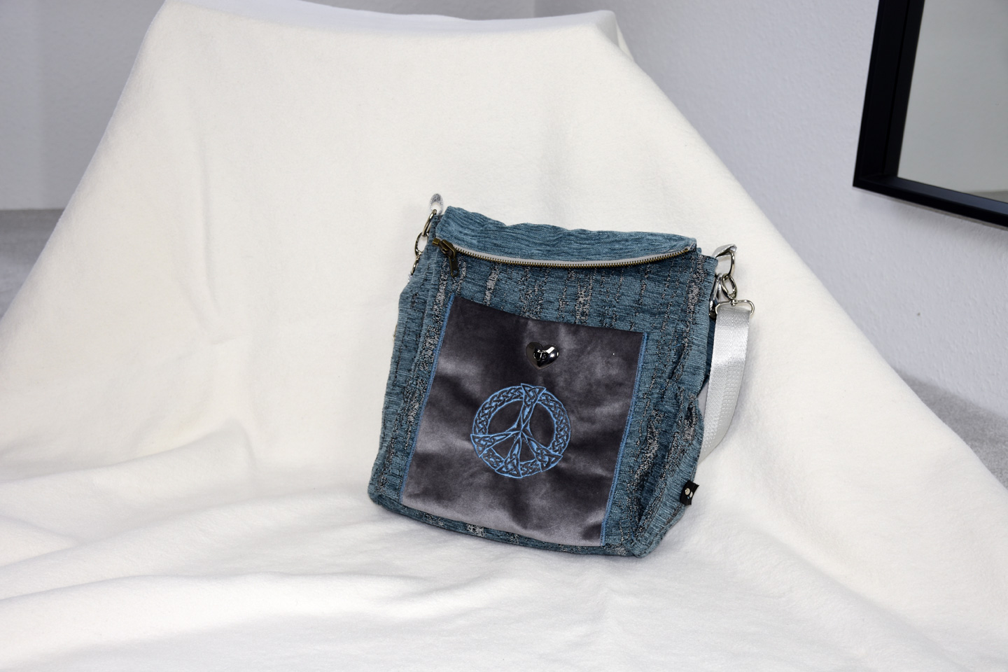 Zusätzlich ein innenliegendes Fach mit Gummizug und ein Reißverschlussfach in der Innentasche und ein weiteres Außentaschenfach mit Reißverschluss sowie ein Stiftehalter. Dazu das Anhänge-Lesezeichen geflochten aus Stoffresten.