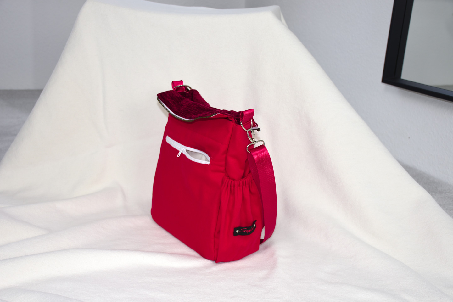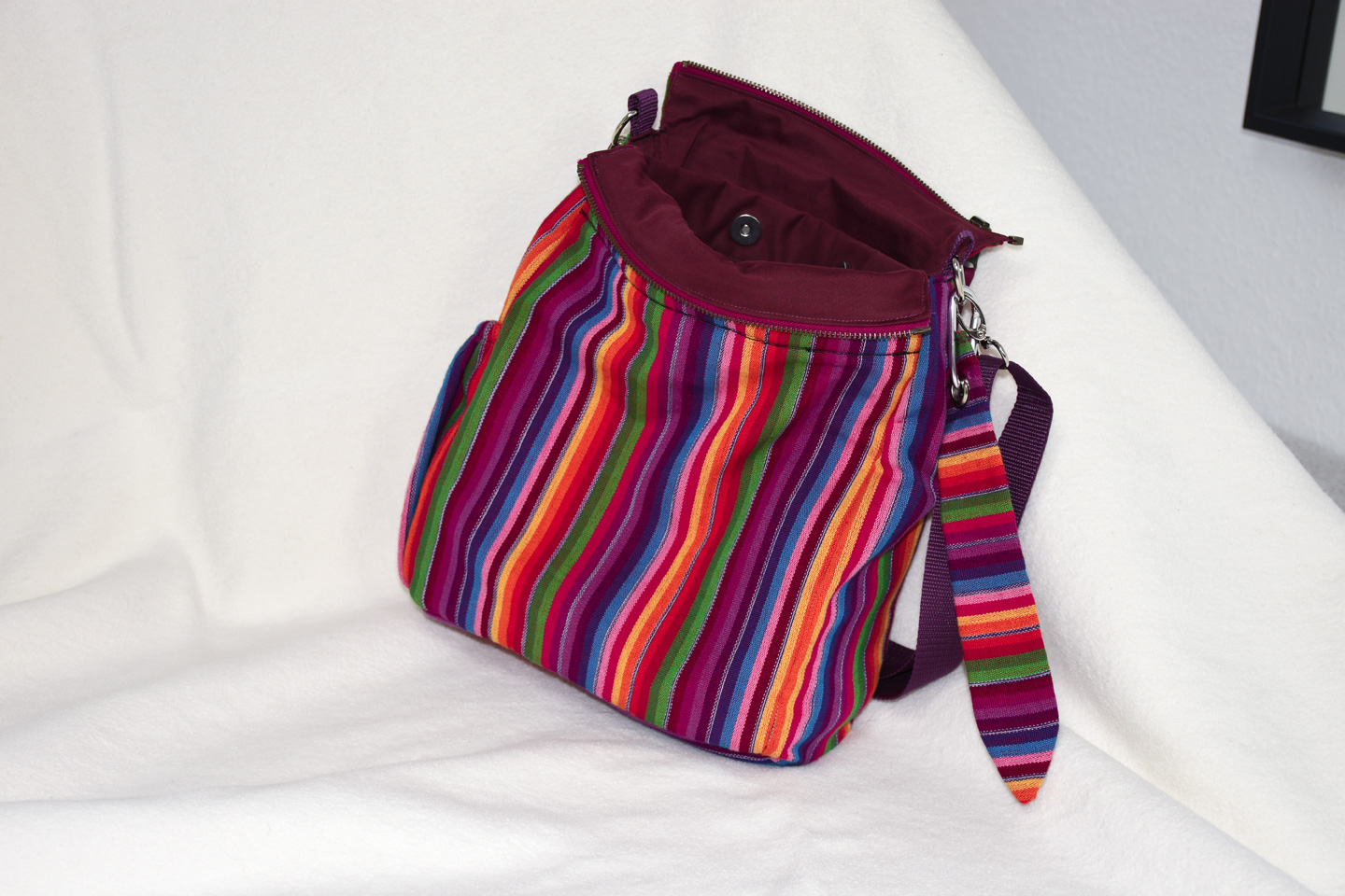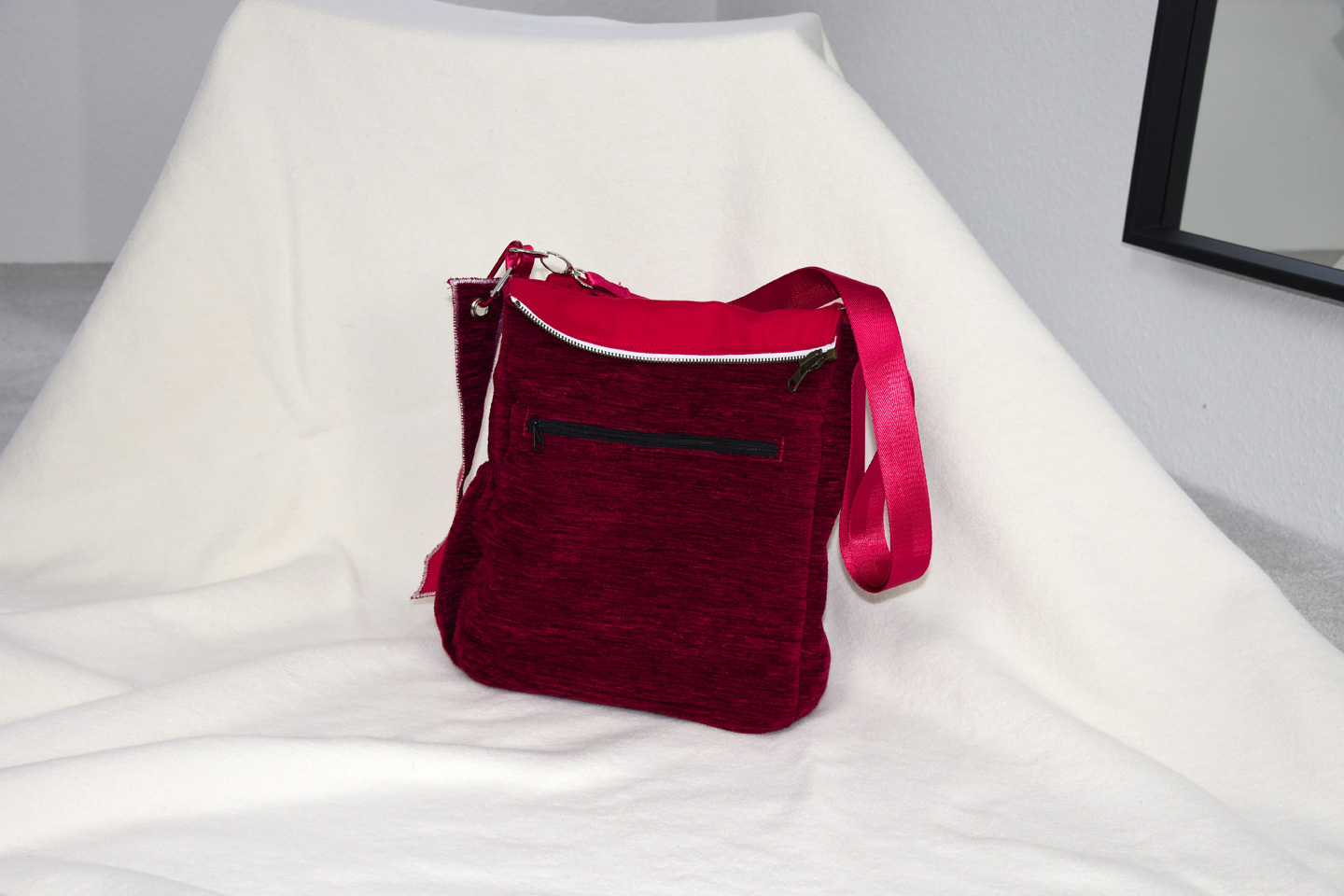 Zusätzlich ein innenliegendes Fach mit Gummizug und ein Reißverschlussfach in der Innentasche und ein weiteres Außentaschenfach mit Reißverschluss sowie ein Stiftehalter. Dazu das Anhänge-Lesezeichen geflochten aus Stoffresten.