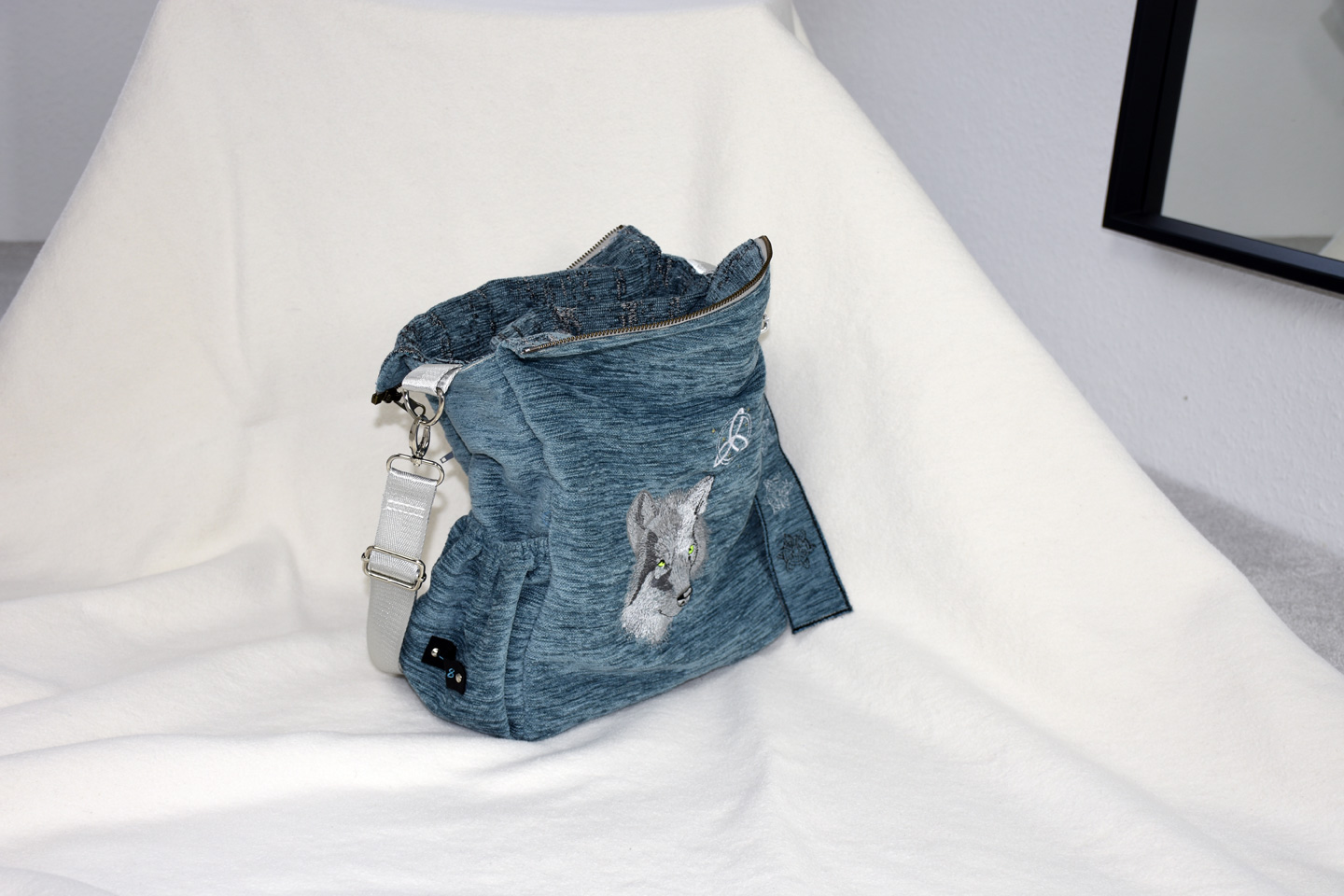 Grundfarbe und Stickmuster: Denim Blau, silbergrauer Wolf, innen keltisches Zeichen in blau