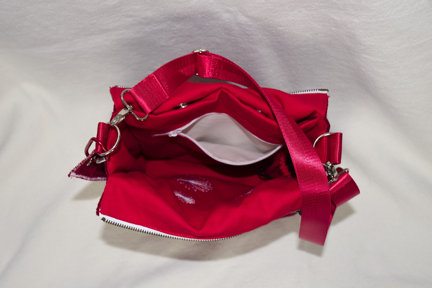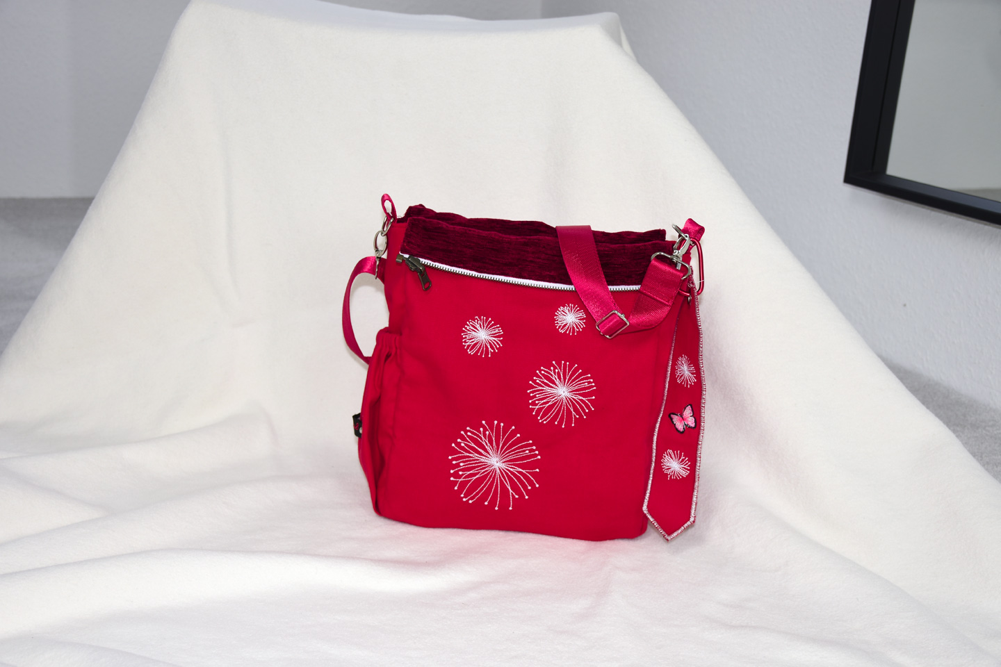 Die Wendetasche Crazy-Fly hat ein rotes Innenfutter passend zum edlen Außenstoff. Das Stickmuster zeigt ein Blumen-Schmetterling und gewendet Pusteblumensamen.