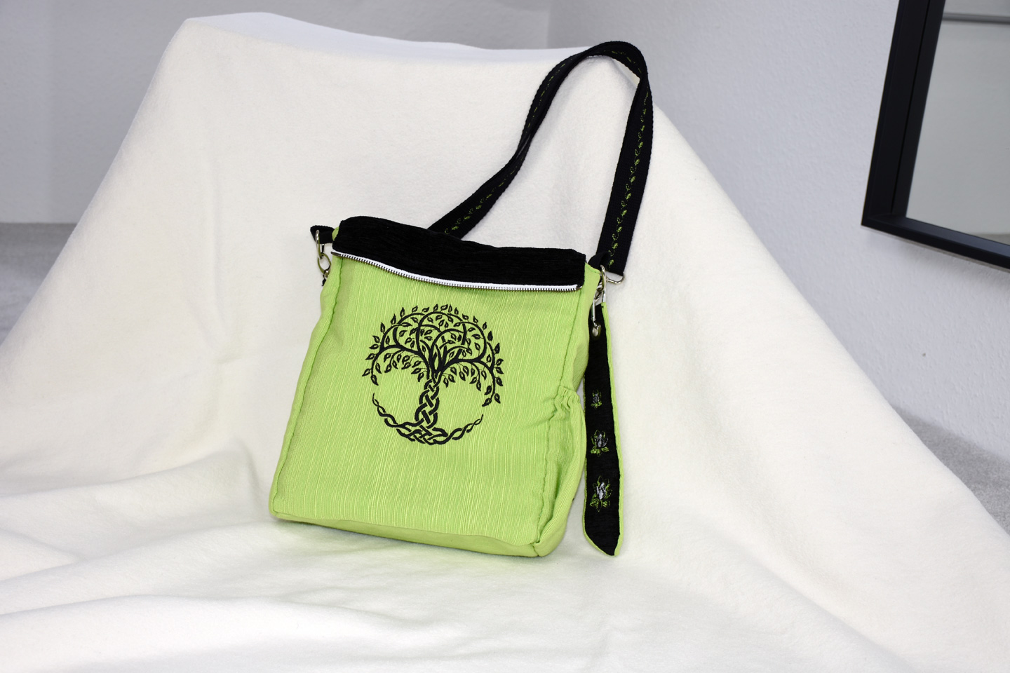 Grundfarbe und Stickmuster: schwarz/kiwigrün, Buddha Frauen Kopf /weiß/grün, Lebensbaum /schwarz